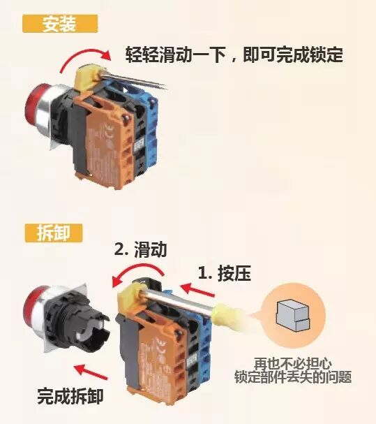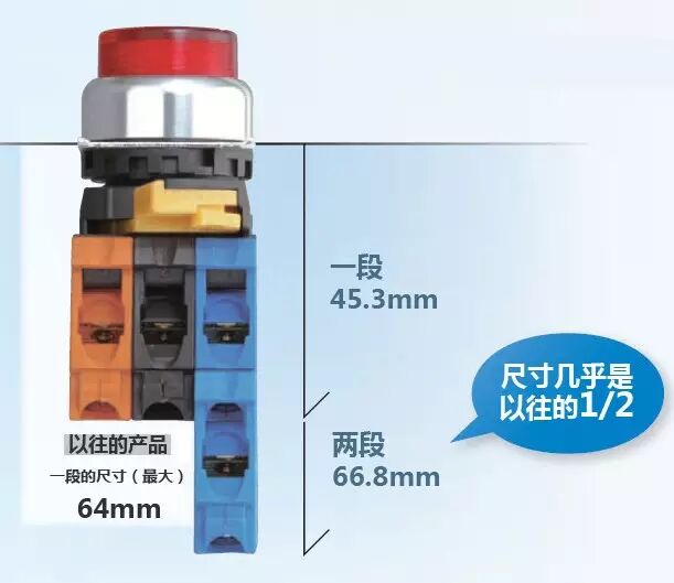 即使安裝三個(gè)開關(guān)部,也不會(huì)加大它的尺寸。并且開關(guān)部采取通用顏色區(qū)分(NO:藍(lán)色/NC:橙色),可有效地防止配線錯(cuò)誤。